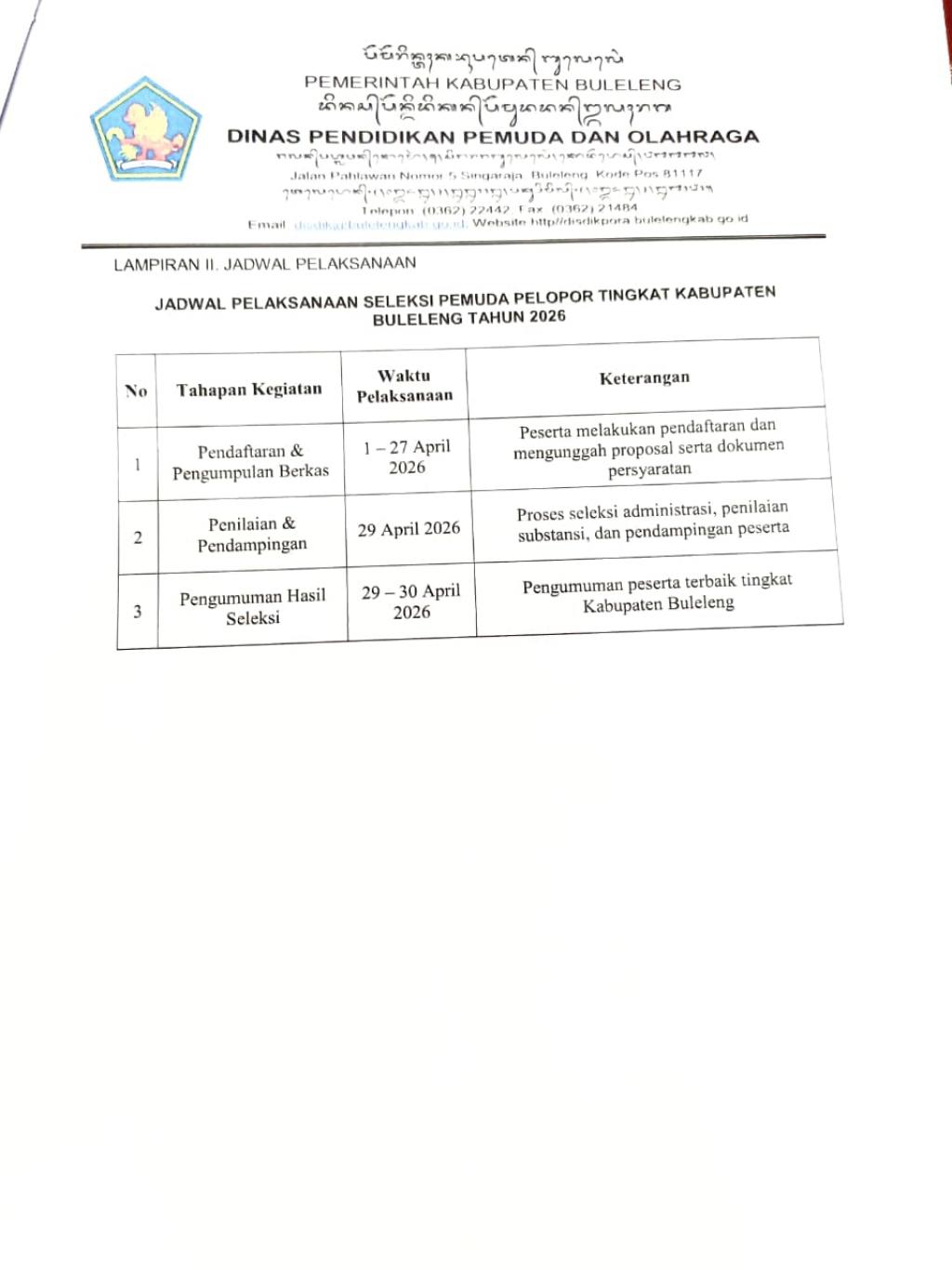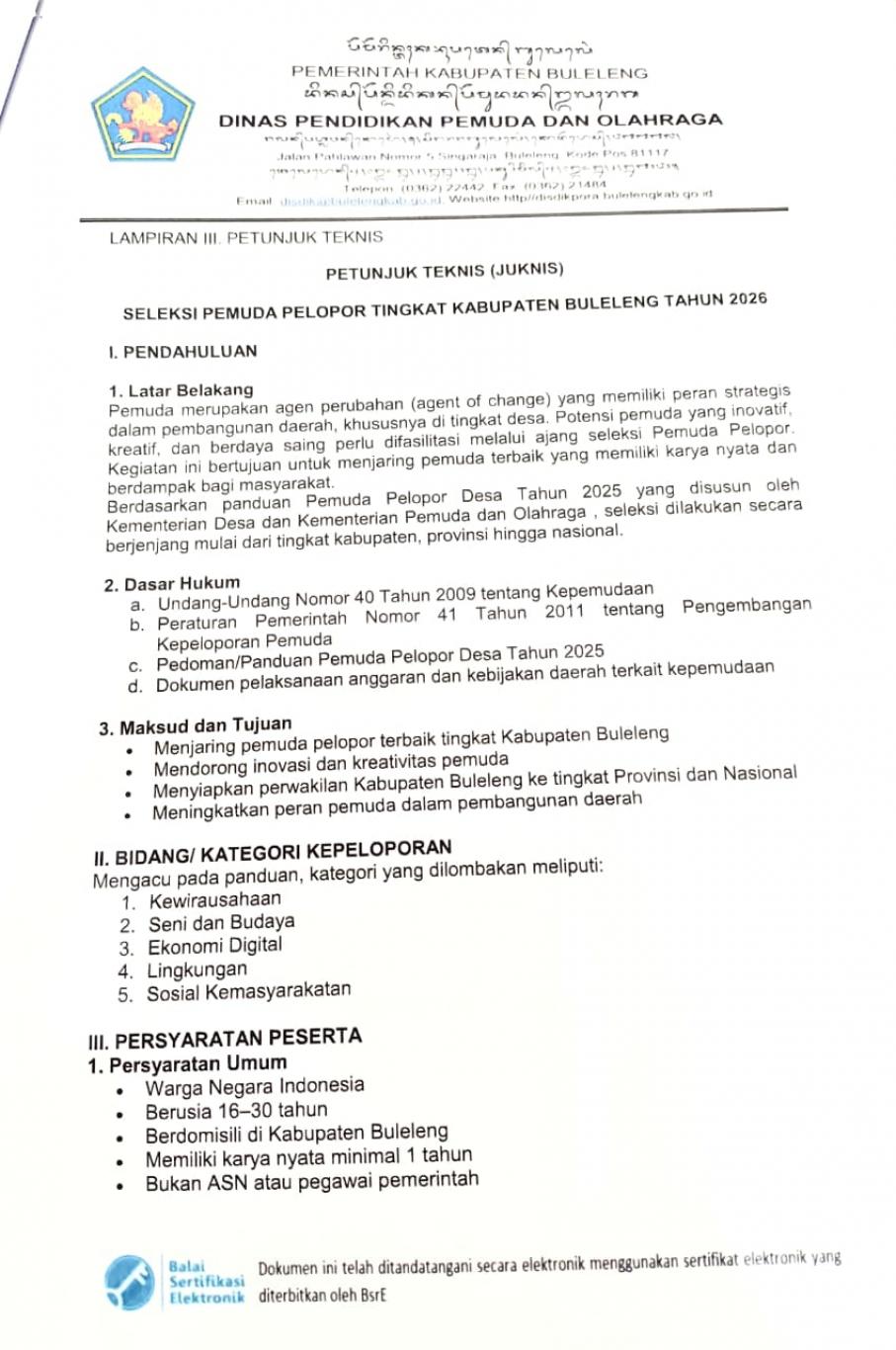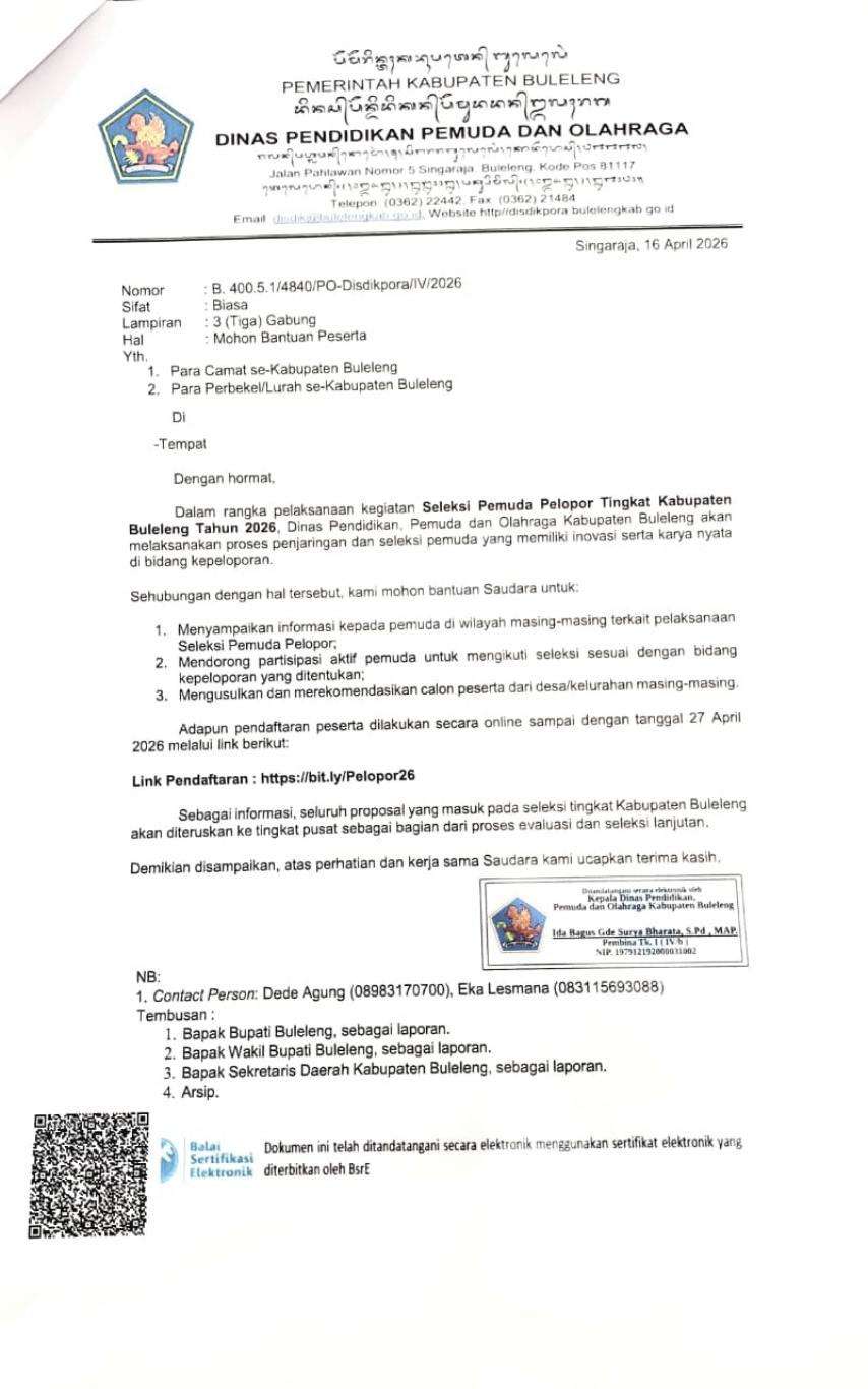 Dalam Rangka Pelaksanaan Kegiatan ''SELEKSI PEMUDA PELOPOR TINGKAT KABUPATEN TAHUN 2026'' Dinas Pendidikan, Pemuda dan Olahraga Kabupaten Buleleng Akan Melaksanakan Proses Penjaringan dan Seleksi Pemuda Yang Memiliki Inovasi Serta Karya Nyata di Bidang Peloporan.